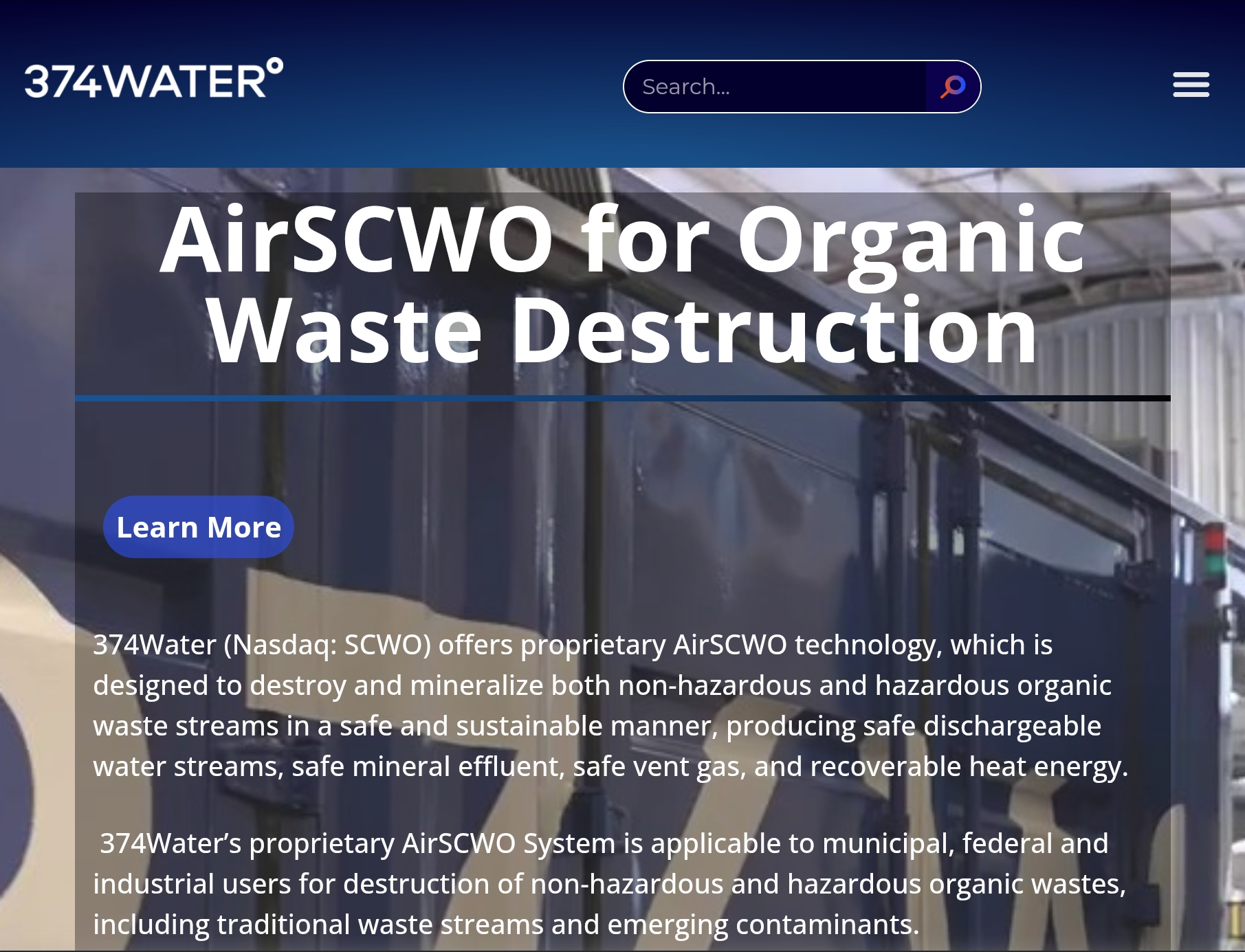 374워터는 유해 유기 폐기물 및 복합 폐수 내 유기성 오염물질을 고온·고압 상태의 초임계 수(水) 산화 (Supercritical Water Oxidation, SCWO) 기술로 분해하는 폐기물 처리 솔루션을 제공한다.