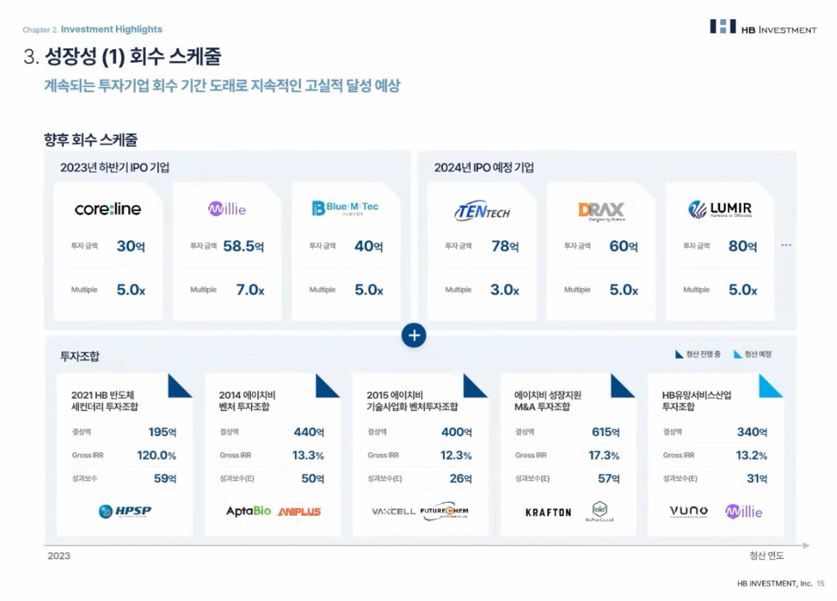 HB인베스트먼트가 보유하고 있는 포트폴리오 중 연내 IPO 추진 예정인 기업은 비모뉴먼트, 반도체 양자물리 보안 기업 ICTK, 피부과 레이저기기 제조기업 텐텍, 의료 영상기기 제조기업 SG헬스케어, 위성체 및 위성데이터서비스 제공 기업 루미르 등이라고 한다.
