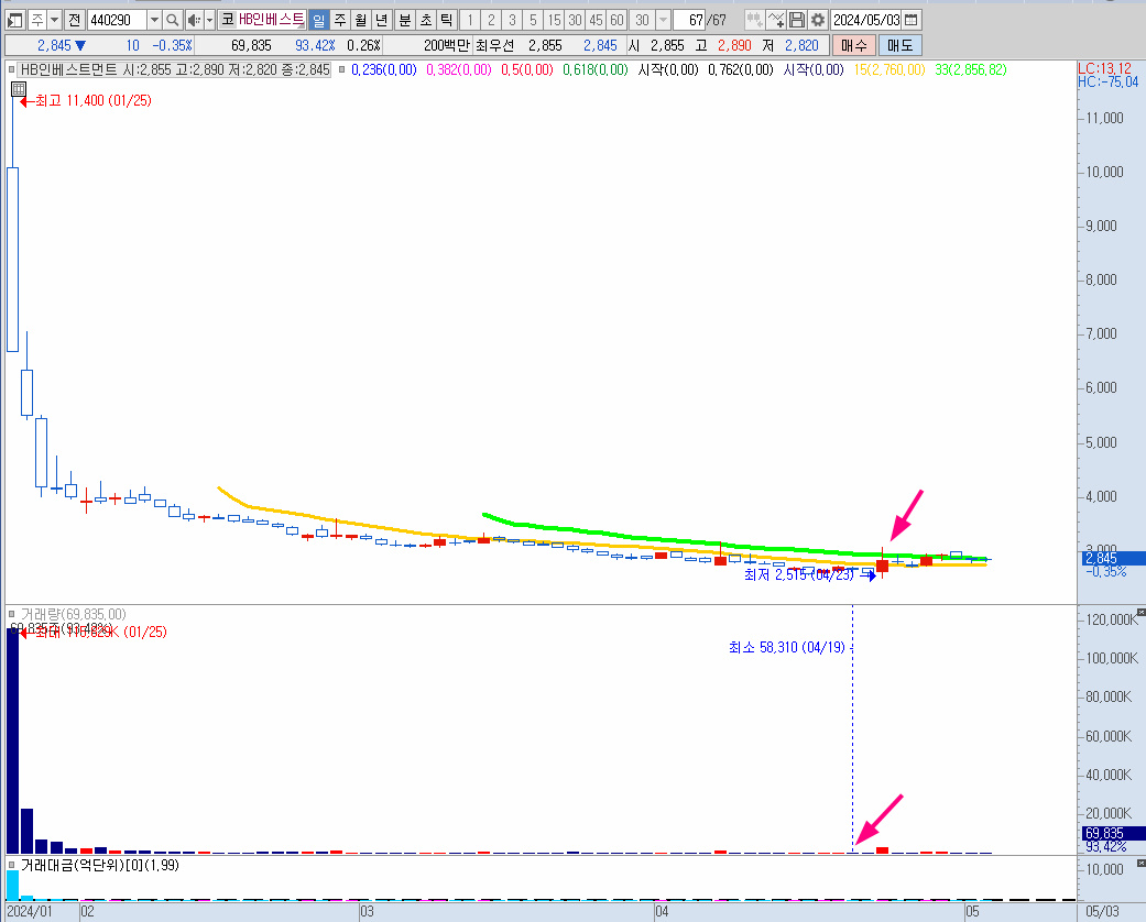 거래량이 최소화된 시점에 17% 윗꼬리를 주고 상승한 것은 이평을 돌리는 시작인지 기대되는 상황이다.