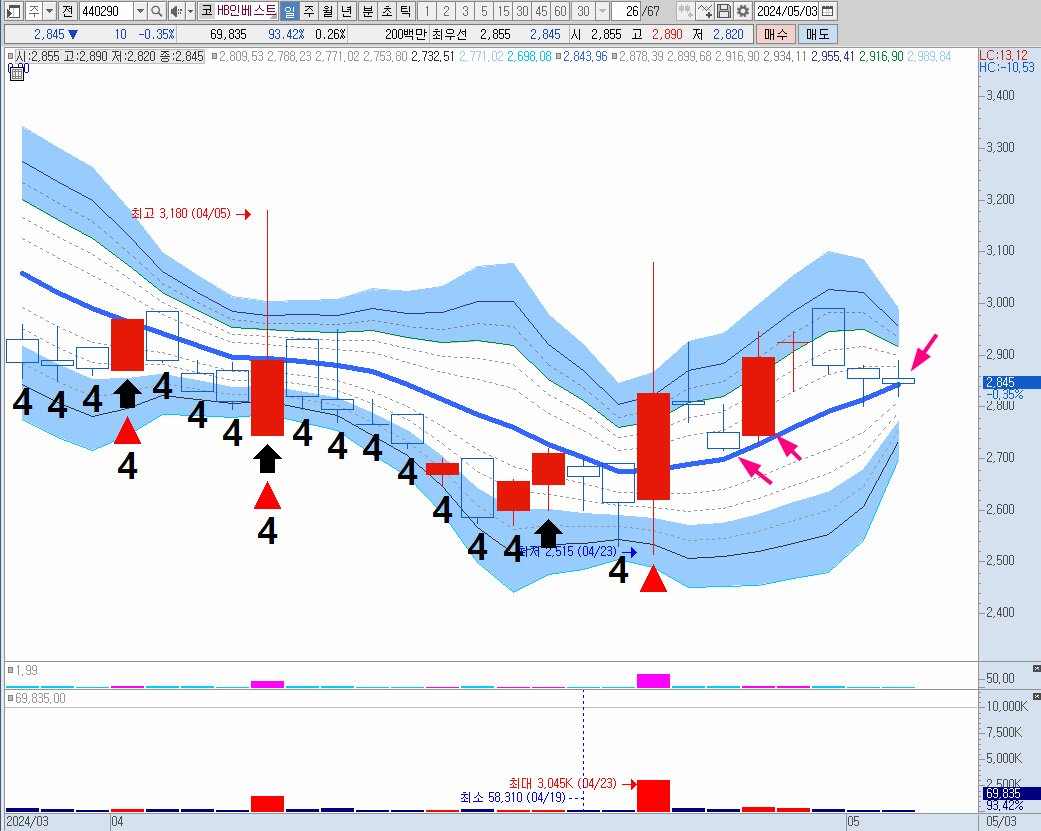 4월 23일 윗꼬리 장대양봉 이후 8일선 지지 중인데 지켜봐야 할 부분이다.