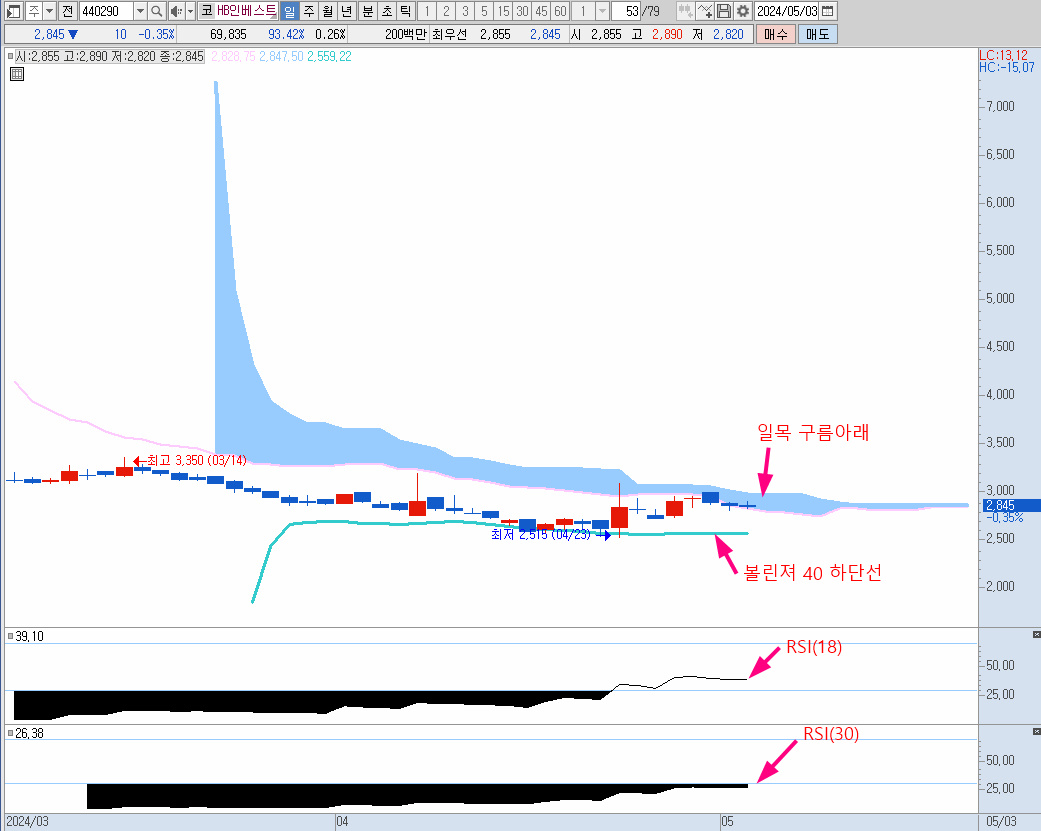 볼린져 40 하단선 터치 후 횡보, RSI(30) 아직 침체 이탈 하지 않았고