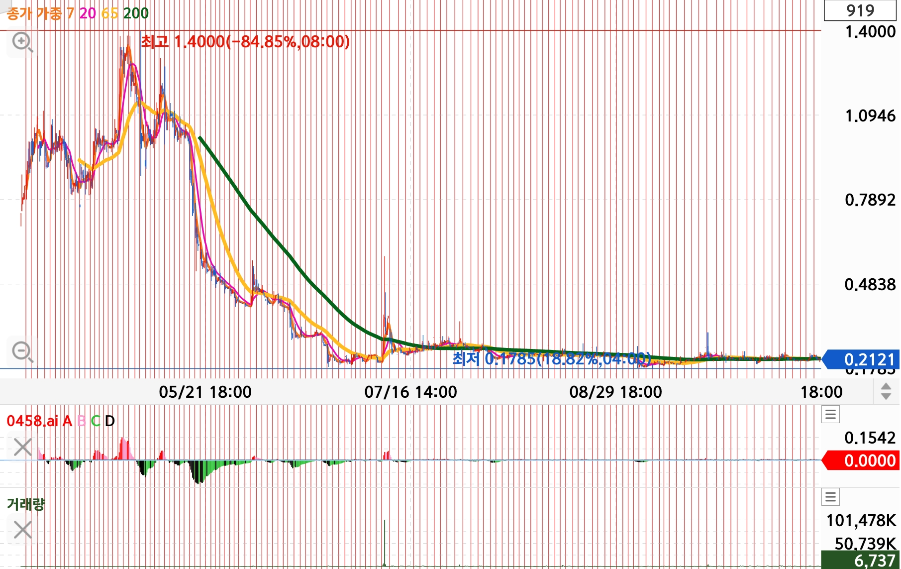 상장가에서 약 95% 하락 후 반등하고 있습니다.