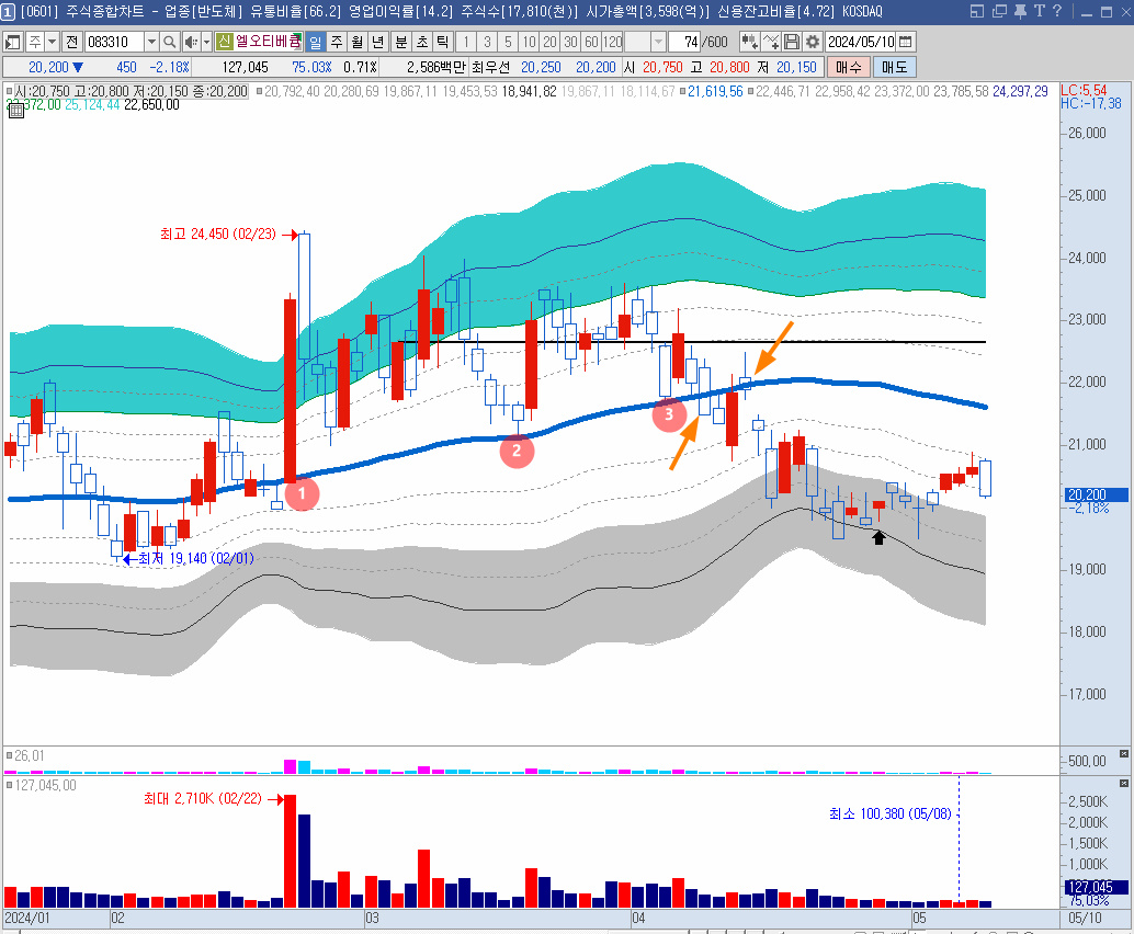 좀 밀착해서 들여다보면 최근 상승이 있었던 아래의 1번 캔들부터 2, 3번이 지지를 받은 선은 파란색 45일선이다.