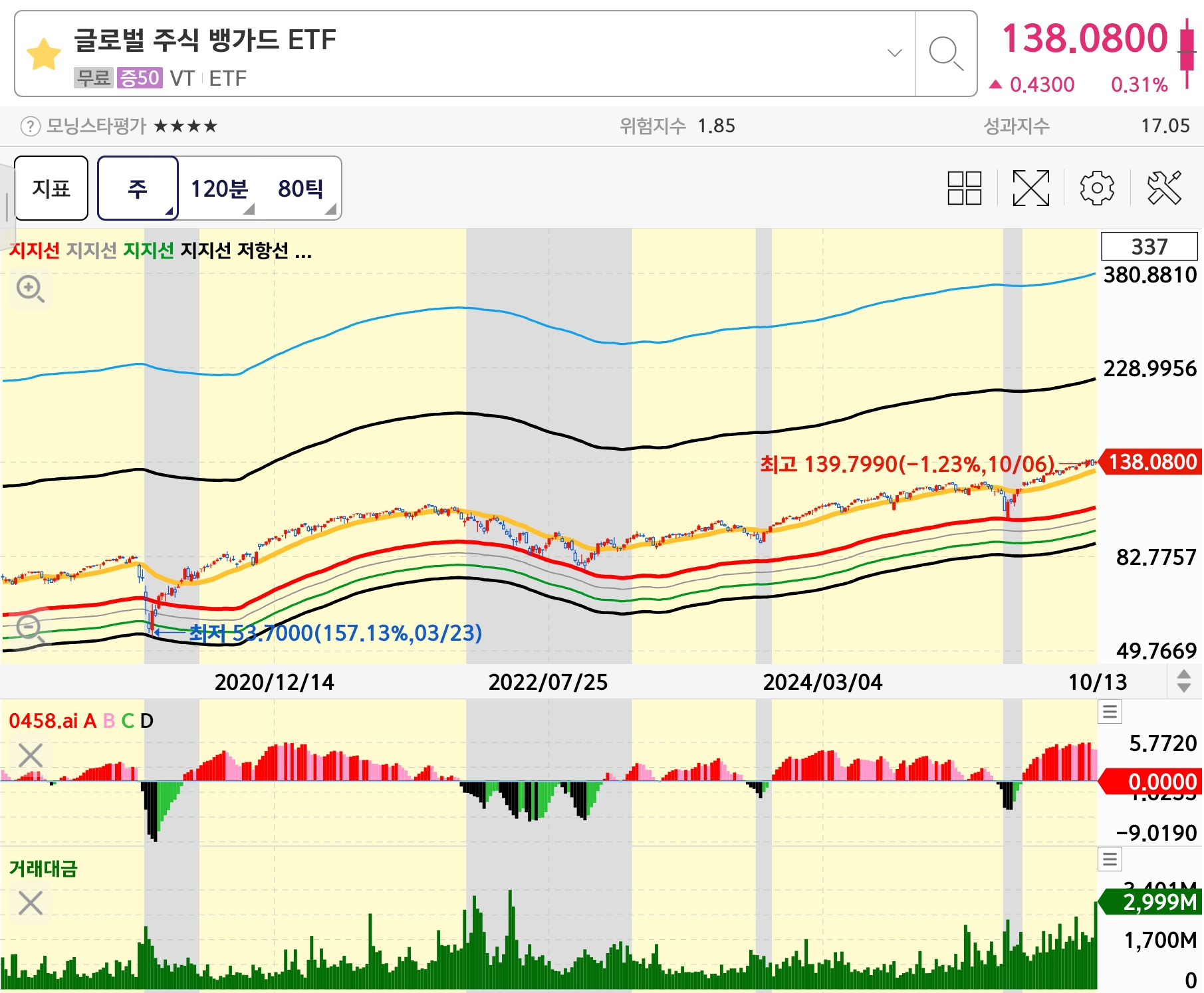 즉, 현재 구간은 “미국 강세 + 신흥국 정체”가 공존하는 구조로, VT는 완만한 상승세 속에서도 단기 박스권(135~140달러) 흐름을 나타내고 있습니다.
