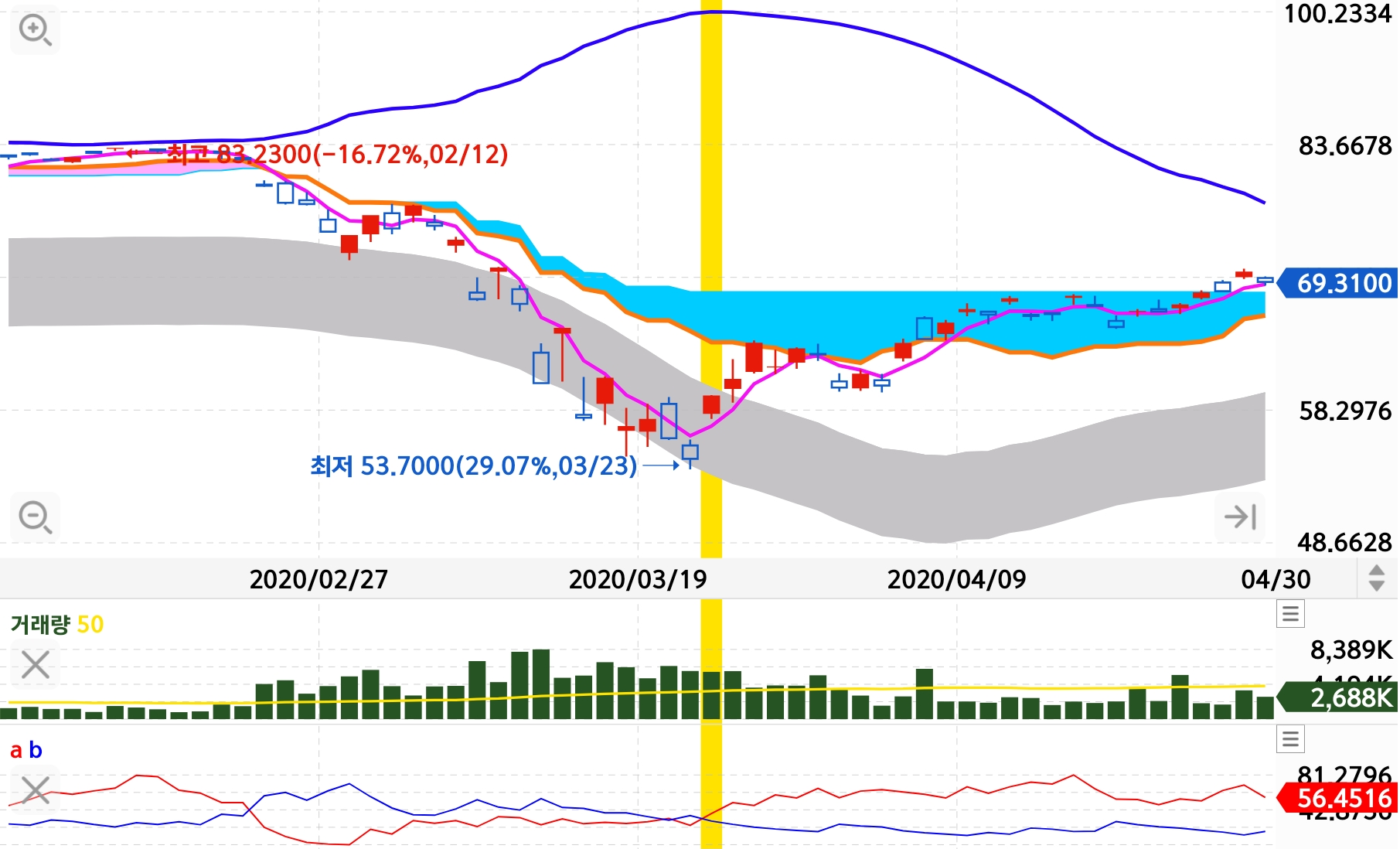 5일선 이탈기준 약 35% 하락 ($82-->$53) 코로나 이슈