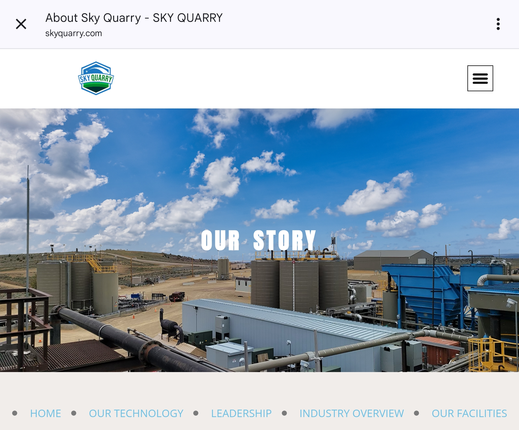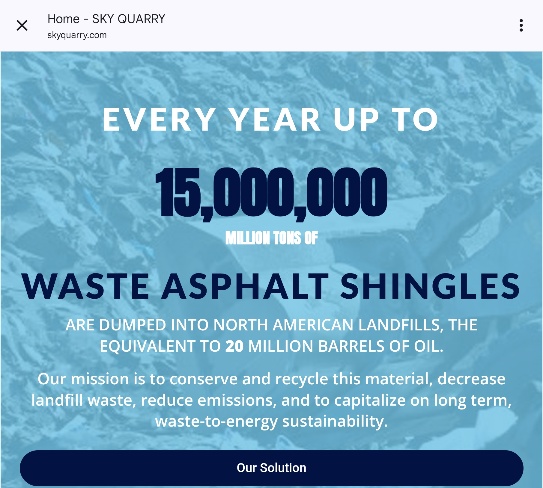 Sky Quarry Inc. 는 폐 아스팔트 슁글과 오염된 토양에서 재활용 가능한 자원을 회수하는 친환경 정제 및 재활용 기업입니다. 유타주 우즈크로스(Woods Cross)에 본사를 두고, 자체 공정을 통해 비투멘(bitumen)과 오일을 추출하여 재활용 및 재정제(refining) 시장에 공급합니다.