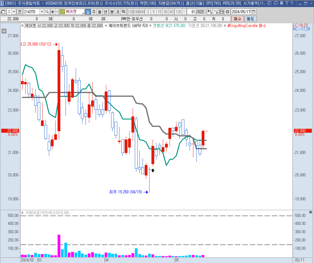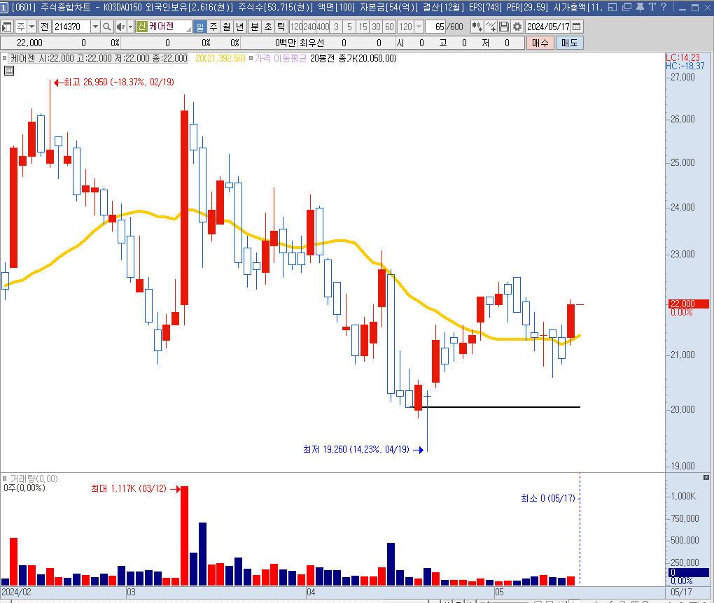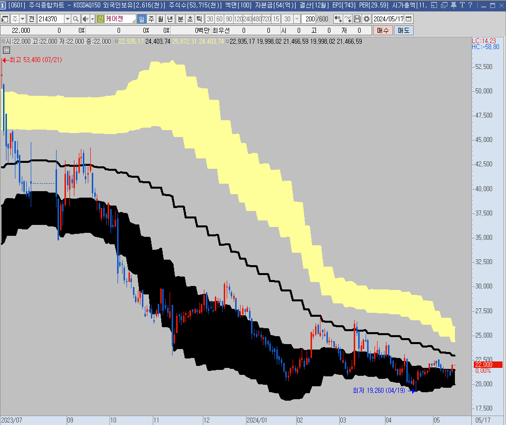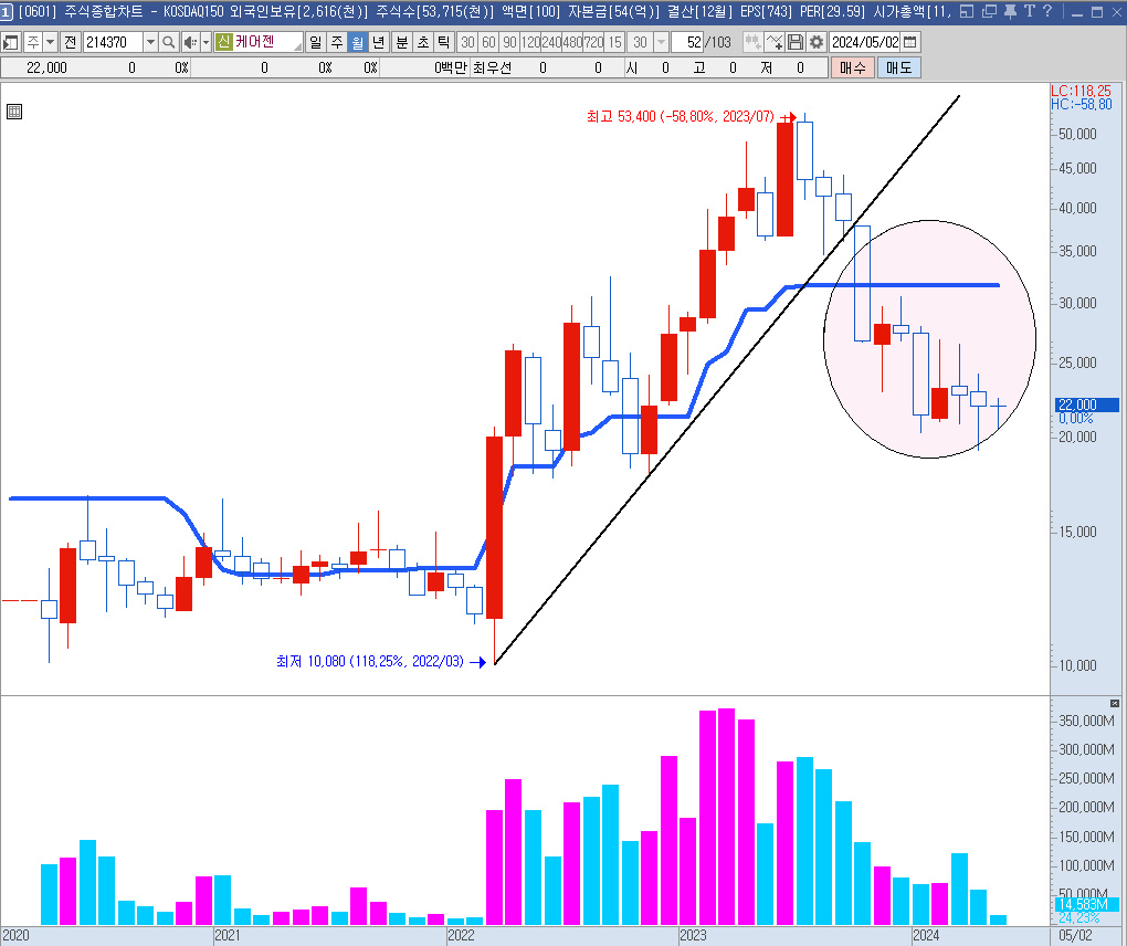 여러 화장품 관련 회사들의 움직임을 보다가 하락이 가팔랐던 케어젠을 살펴보기로 했다.
