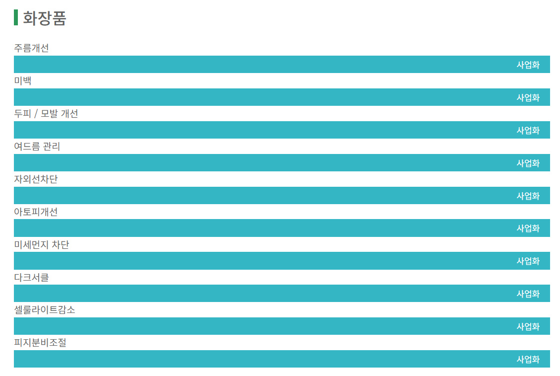 주름개선, 미백, 두피, 모발개선, 여드름관리, 자외선차단, 아토피개선, 다크서클 등 사업화하고 있다고 나와있다.