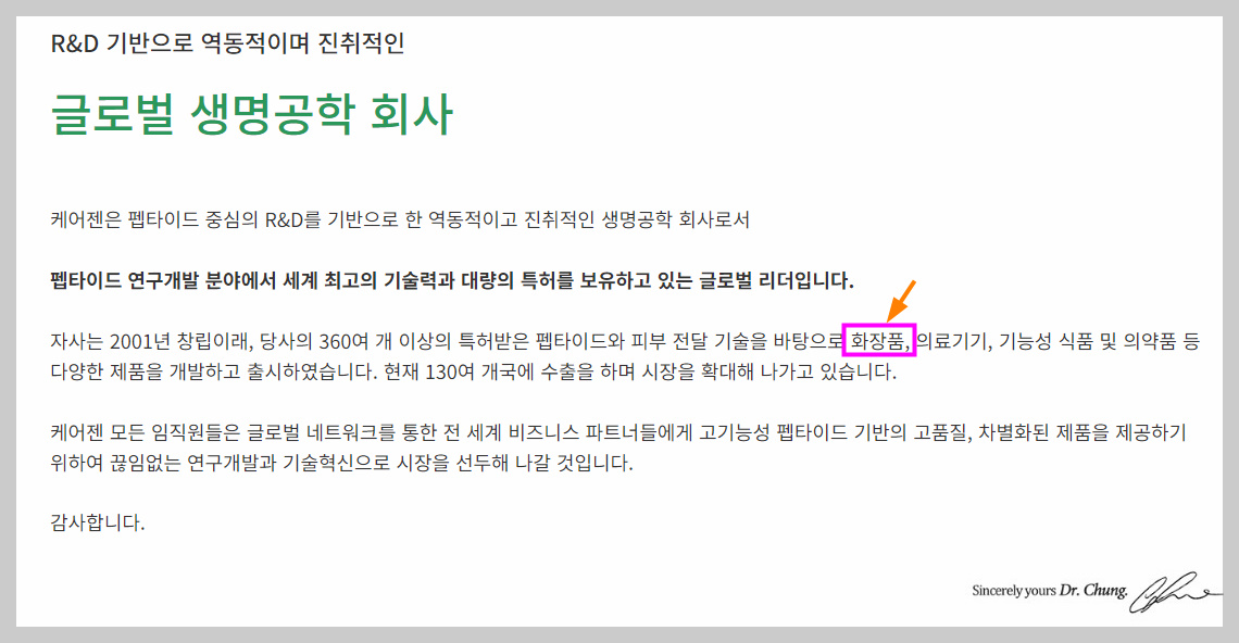 아래는 케어젠 웹사이트에 기재된 회사 설명이다.