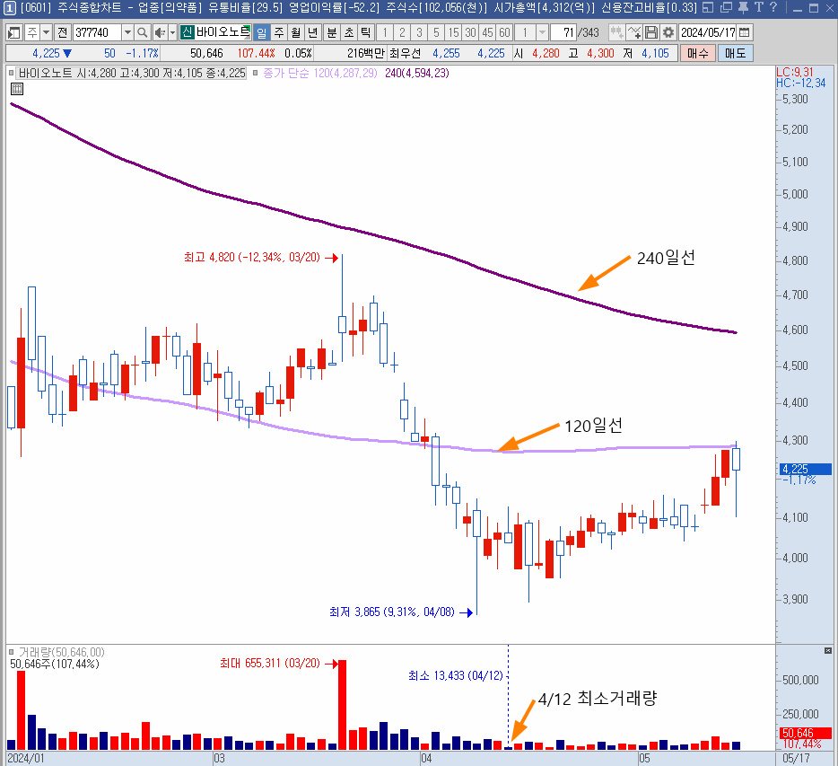 대개는 미국 FDA허가, 또는 USDA(미국농림부) 등 미국이 등장하는 기사가 나오면 호재라고 판단되어 장대양봉 하나 정도는 나오는 게 기본인데 이 종목은 투자심리가 거의 사라졌는지 미동이 없었다. 게다가 최근 4월 12일은 거래소 상장 이후 최소거래량을 경신했다. 주식의 격언에 거래량 바닥이 주가 바닥이라고 했던가.