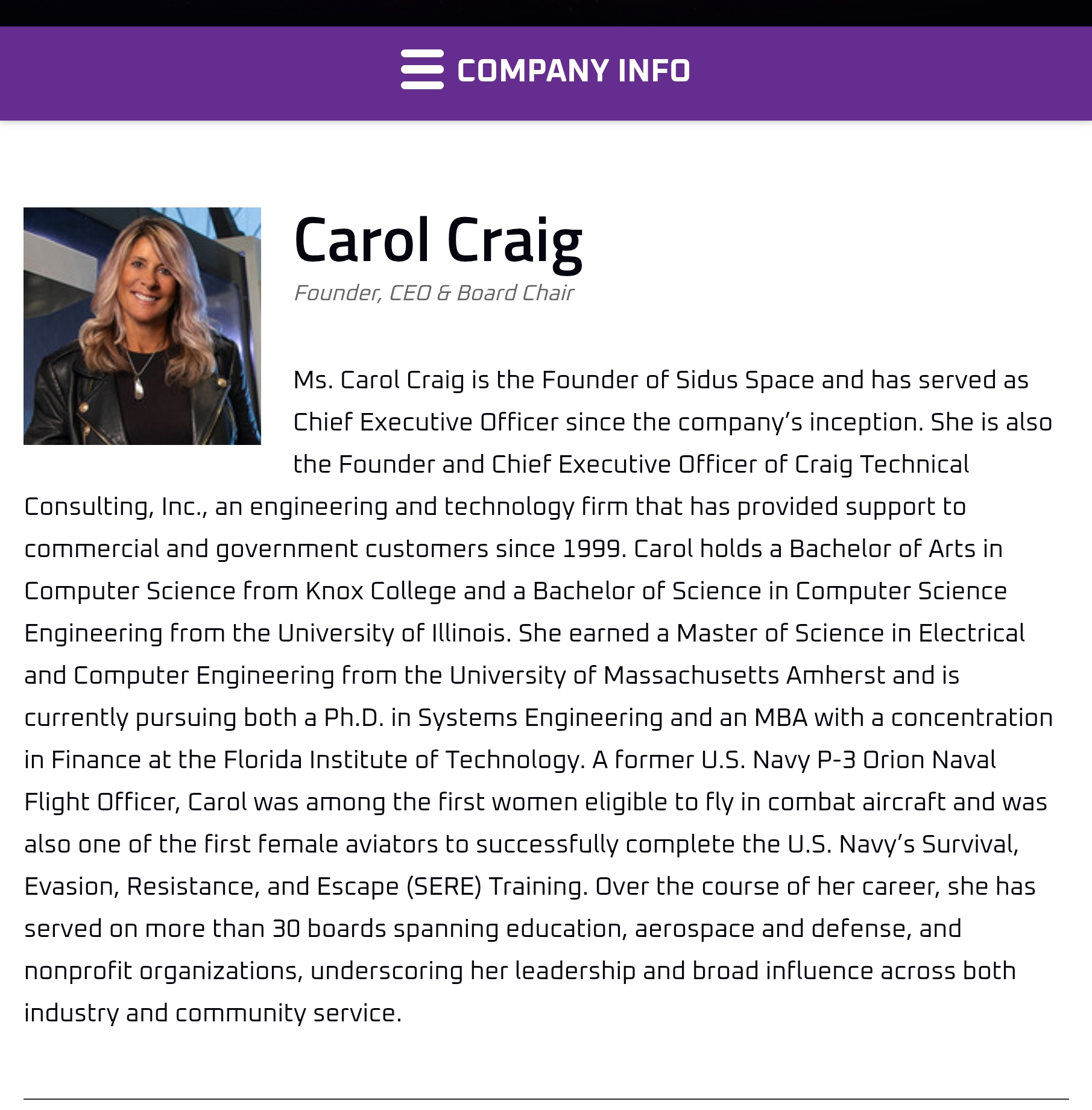 캐럴 크레이그(Carol Craig)는 사이더스 스페이스(Sidus Space)의 창립자로, 회사 설립 이래 현재까지 최고경영자(CEO)로 재직하고 있습니다. 그녀는 또한 1999년부터 상업 및 정부 고객을 대상으로 엔지니어링과 기술 지원을 제공해 온 크레이그 테크니컬 컨설팅(Craig Technical Consulting, Inc.)의 창립자이자 최고경영자이기도 합니다.