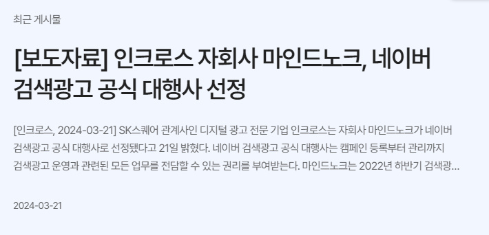 인크로스는 SK스퀘어의 계열회사이고 디지털 광고 미디어랩 사업과 국내 최초의 동영상 애드 네트워크인 '다윈(dawin)' , SK텔레콤의 T deal(티딜)' 운영 대행사업을 주력으로 영위하는 업체이다. 자회사 마인드노크를 통해 검색광고 및 디지털 광고 대행사업을 수행하고 있다.