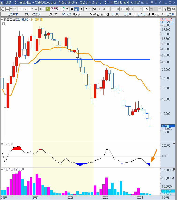 화살표의 보조지표는 CCI인데 침체중이고 하락이 진행 중임을 알 수 있다.