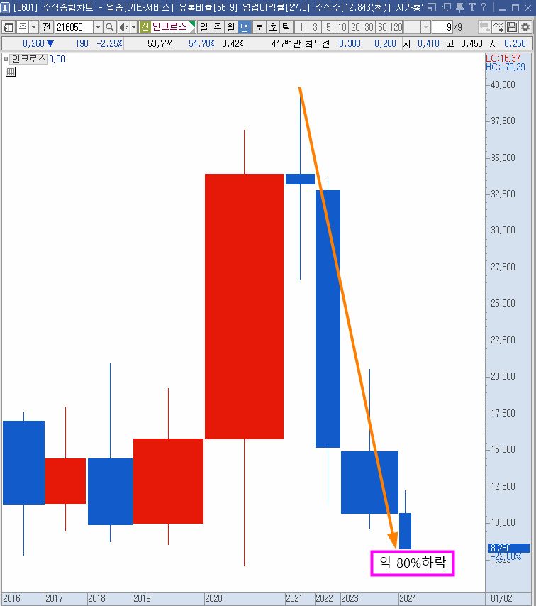 2021년에 전고점을 돌파한뒤 현재일까지 약 80% 하락했다.