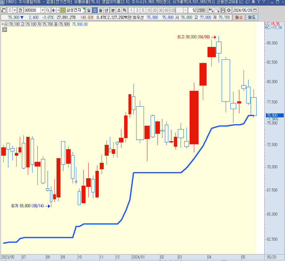 삼성전자의 과거 2년 동안의 흐름에서 최저가 발생일은 23년 9월 30일 51,800원이고 최고가 발생일은 24년 4월 8일 86,000원인데 밴드 상하단의 상승률은 62%, 소요기간은 375일이었다.