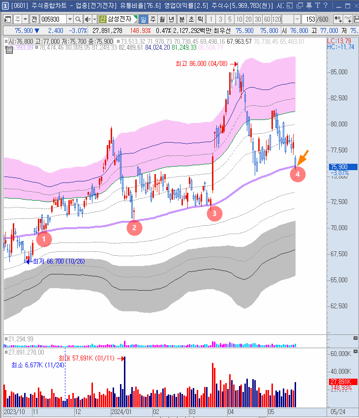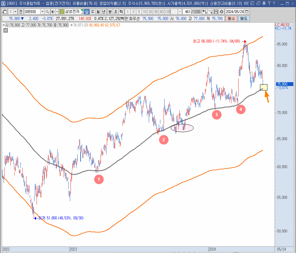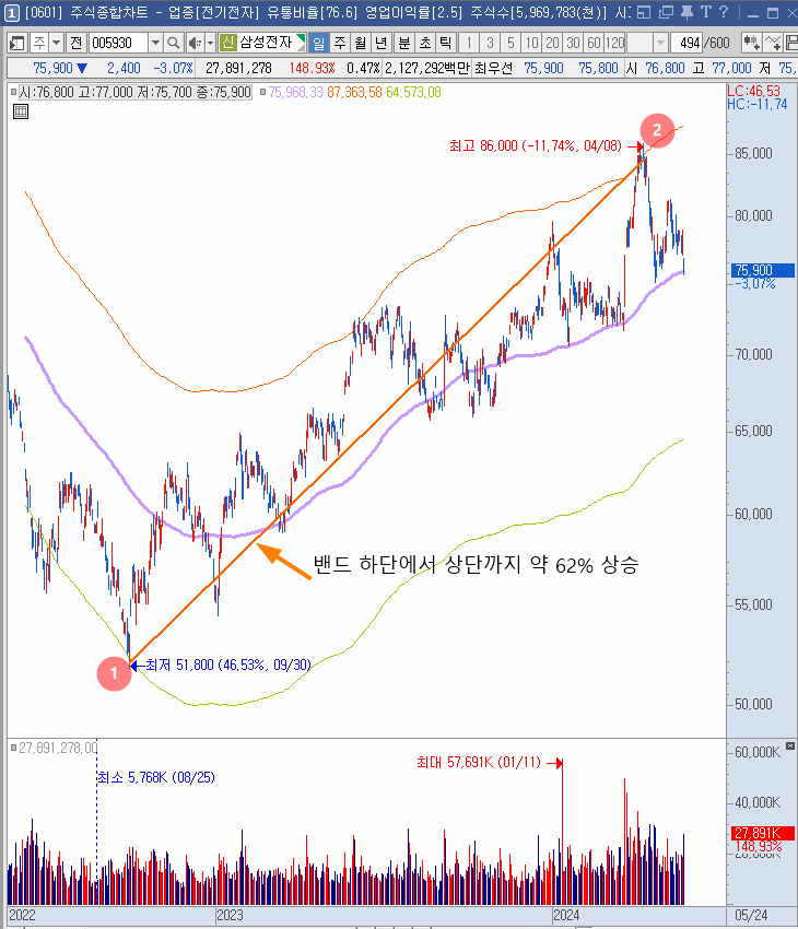 삼성전자의 과거 2년 동안의 흐름에서 최저가 발생일은 23년 9월 30일 51,800원이고 최고가 발생일은 24년 4월 8일 86,000원인데 밴드 상하단의 상승률은 62%, 소요기간은 375일이었다.