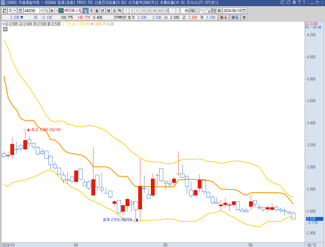최저가격인 2,515의 3~4 틱 아래로 근접해 있고 거래량 바닥이 주가바닥이라는 단순한 접근으로 바라보면 최소거래량도 경신한 상태이다.