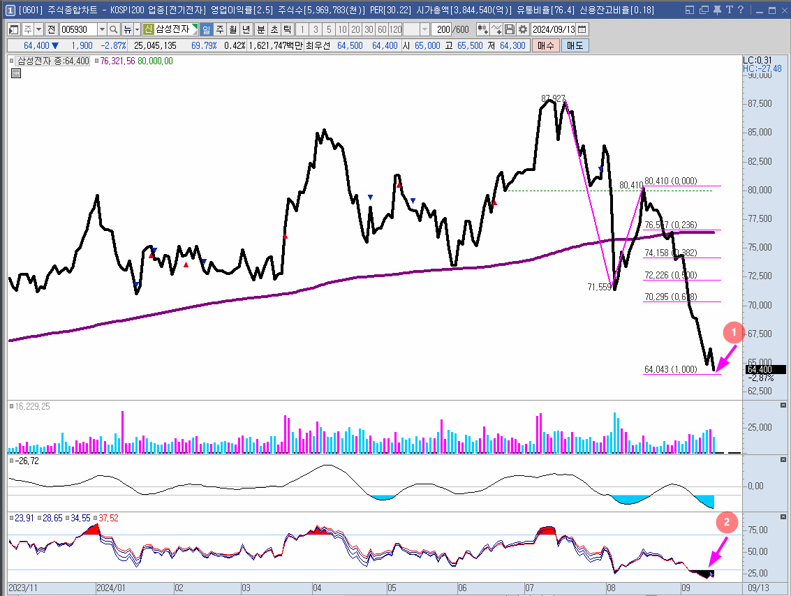 삼성전자의 본격 하락이 시작된 고점을 출발점으로 N자 하락을 그려보니 대략 1번의 위치가 나왔다.