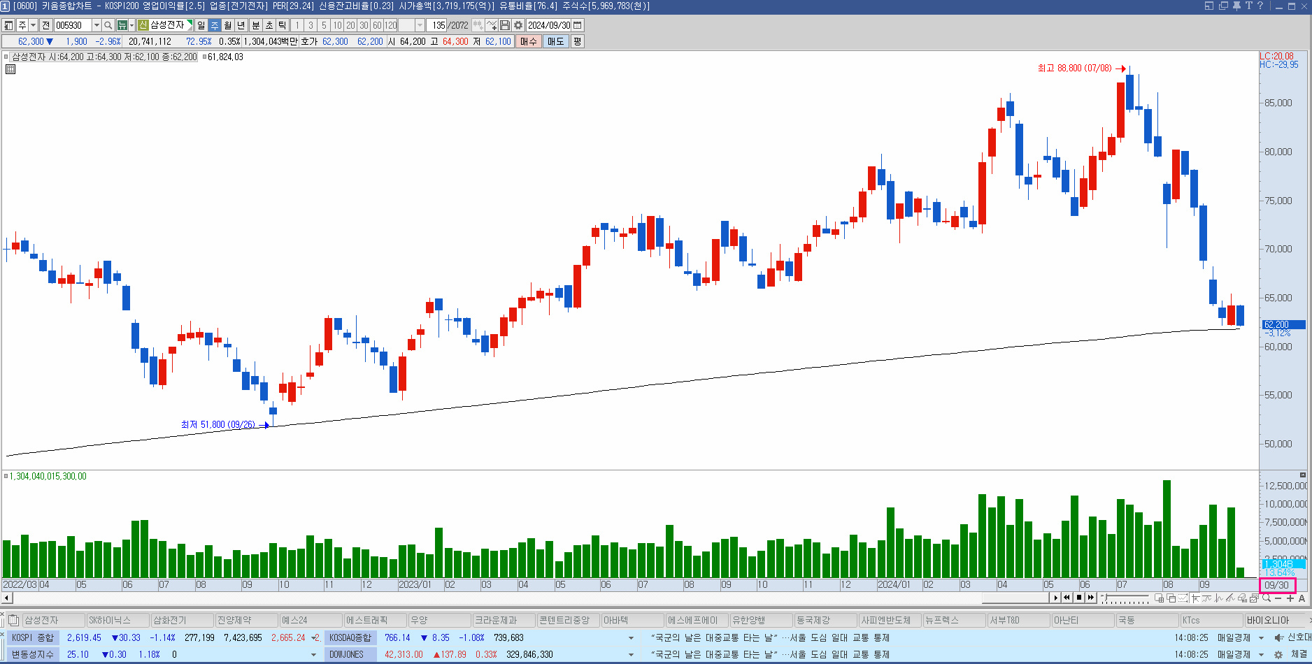 2024년 9월 30일 월요일 PM2시 삼성전자 주봉 차트입니다.