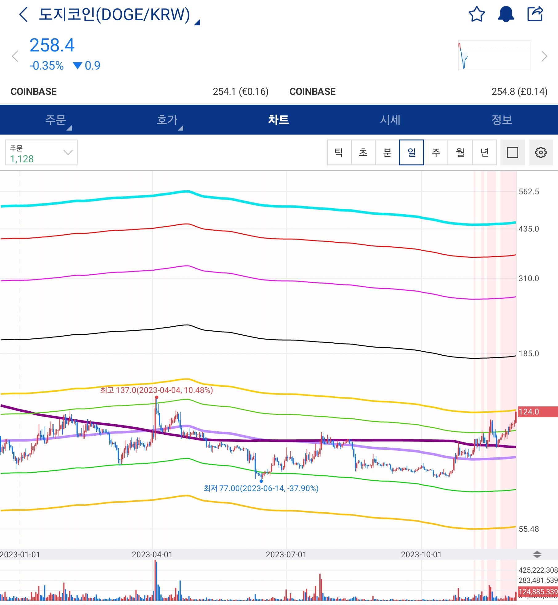 이 차트의 일관성대로 움직인다면 현재의 위치는 저점 또는 저점이 10~20% 정도 남아있는 지점으로 판단할 수 있고 도지코인의 저점은 200원을 깨지 않을 것으로 판단됩니다(이것도 지극히 개인적인 견해입니다)