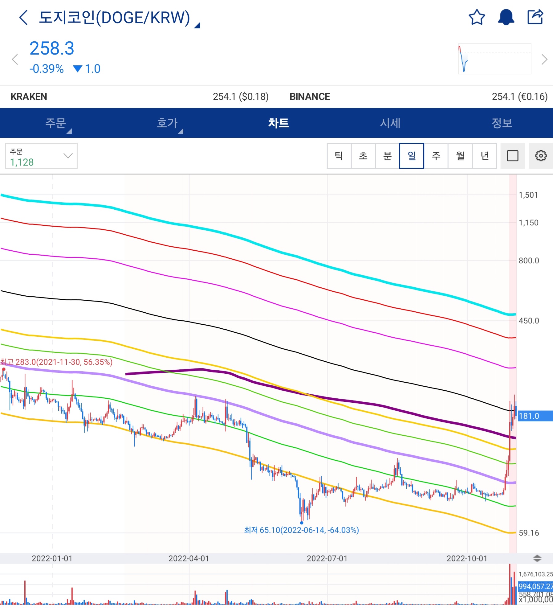 결론부터 얘기하자면 도지코인은 6개월 평균선, 1년 평균선을 이탈한 지 오래입니다.