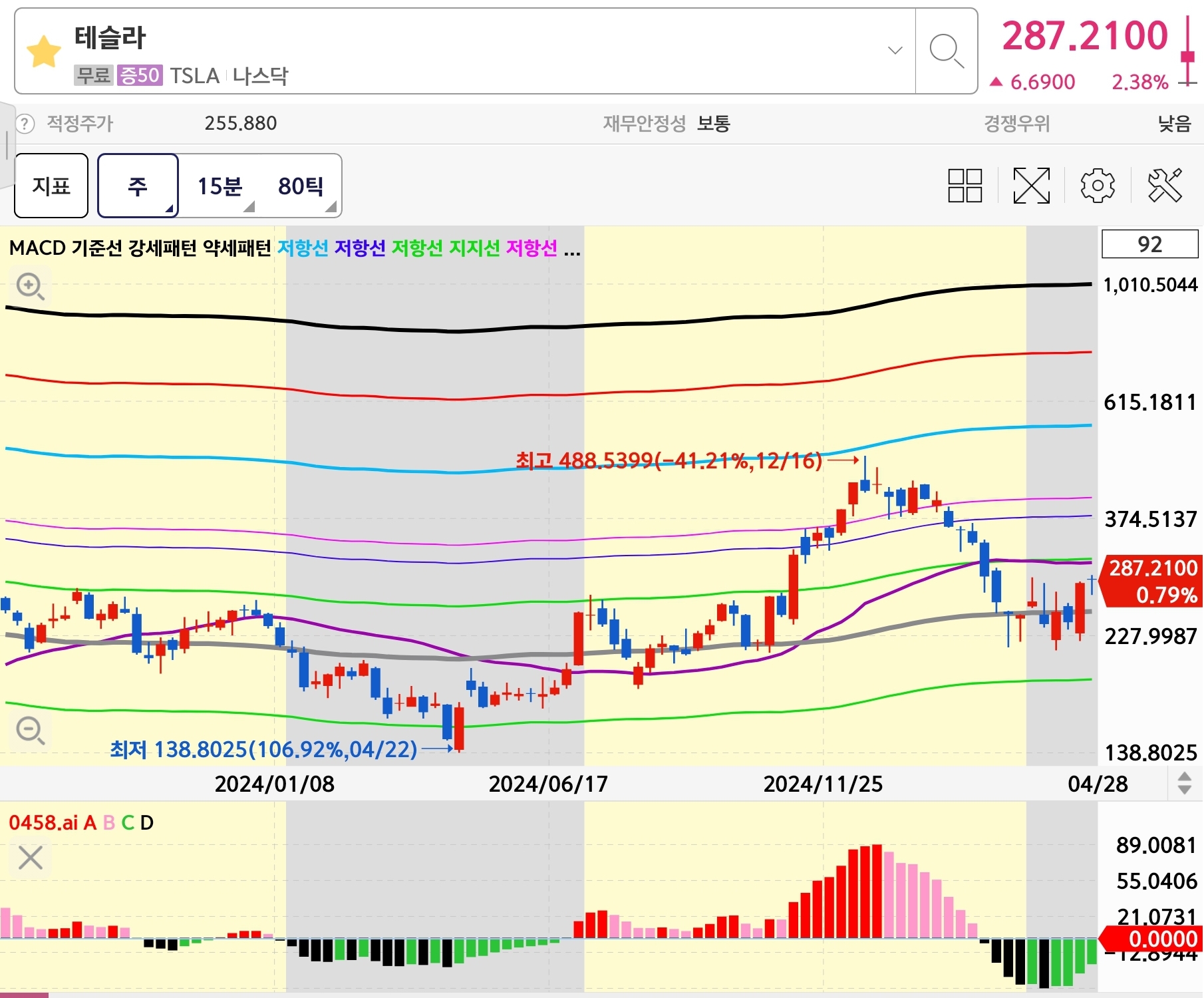 아래는 테슬라의 일봉, 주봉, 월봉 차트입니다.