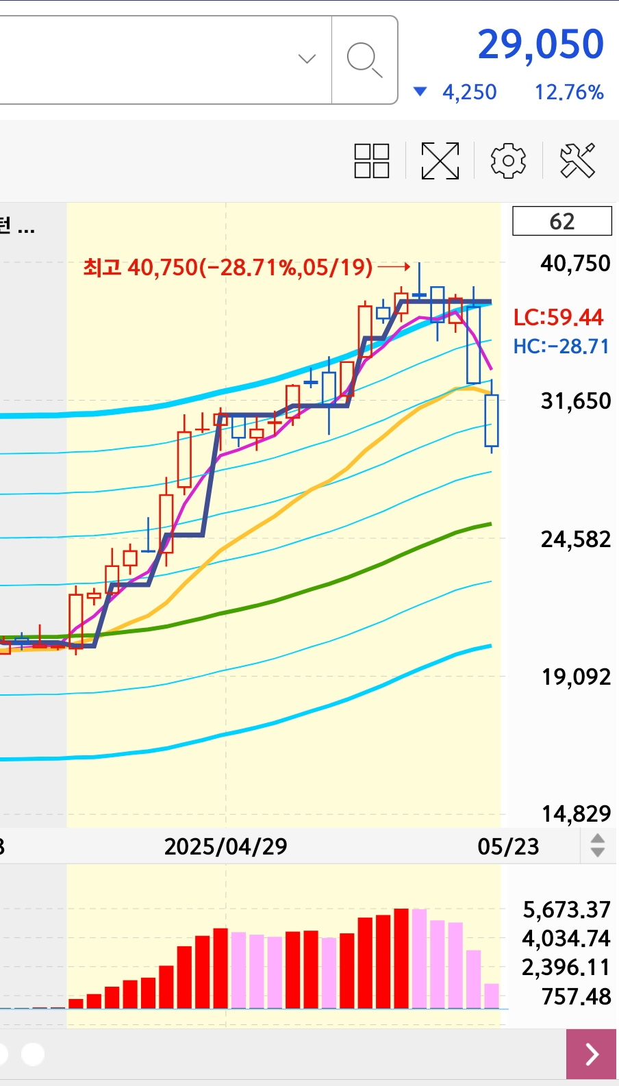 한화솔루션, 3일선 이격을 무너뜨리고 폭락 나오네요.고점에서 거래대금이 이틀연속 나오는데 안타깝습니다.