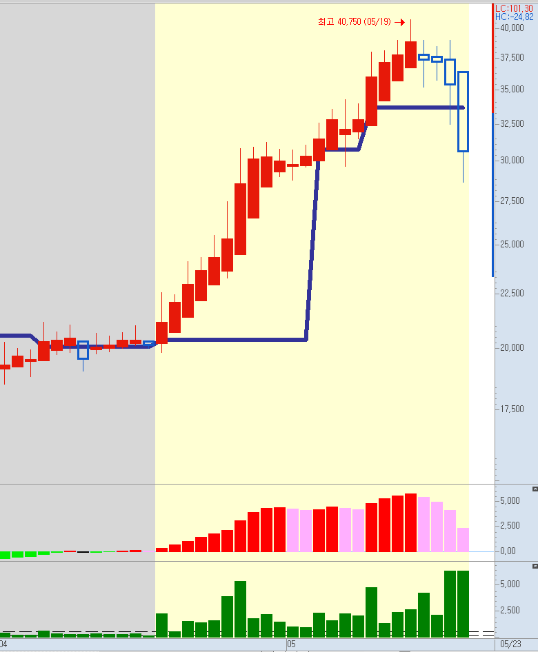 한화솔루션, 3일선 이격을 무너뜨리고 폭락 나오네요.고점에서 거래대금이 이틀연속 나오는데 안타깝습니다.