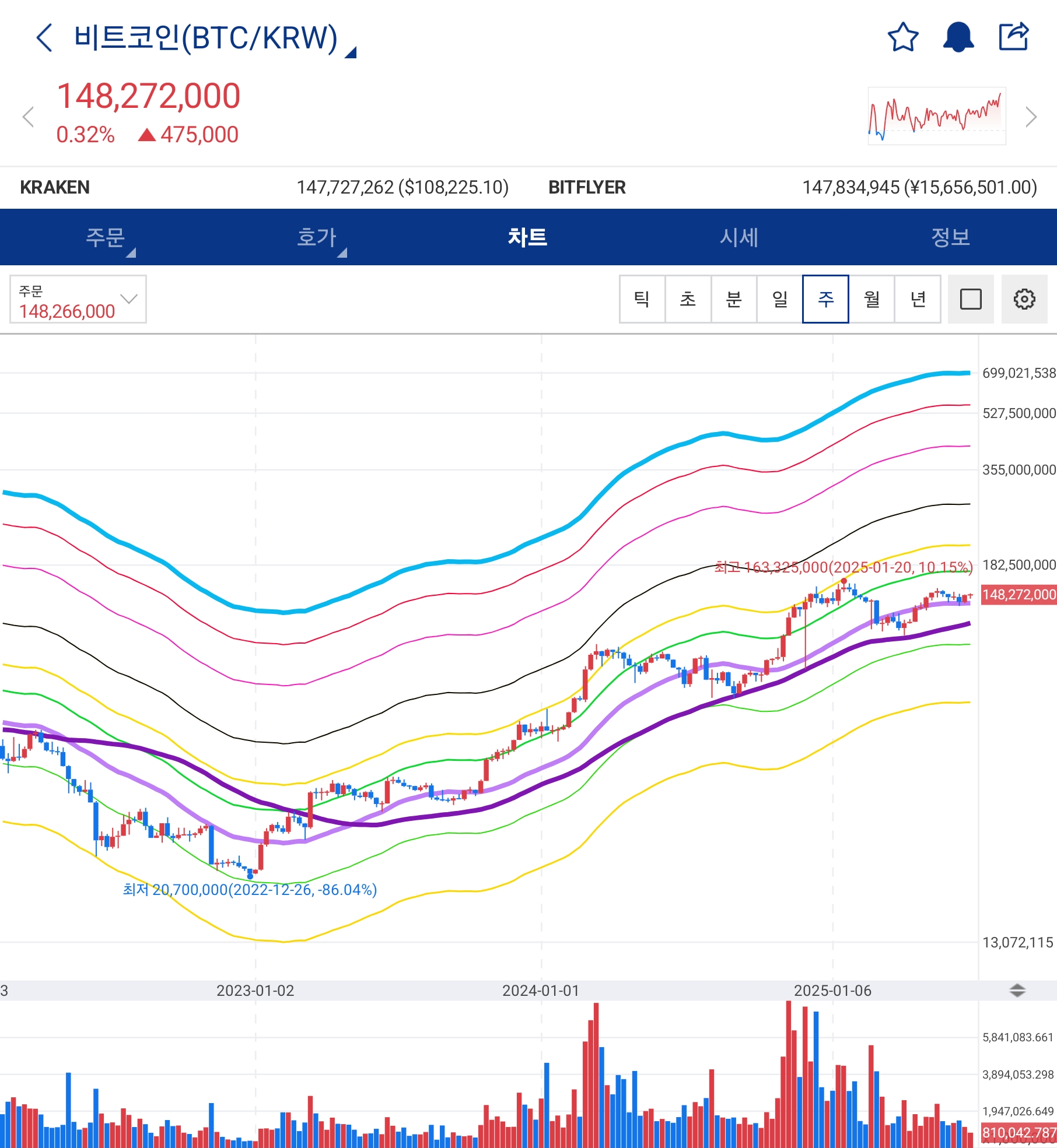 2022~2023년 약세장 기준으로 보면 노란색 하단선(하한선)은 그 이전부터 하락 추세의 종지부 및 반등 시작 구간에서 반복적으로 지지선 역할을 했습니다.