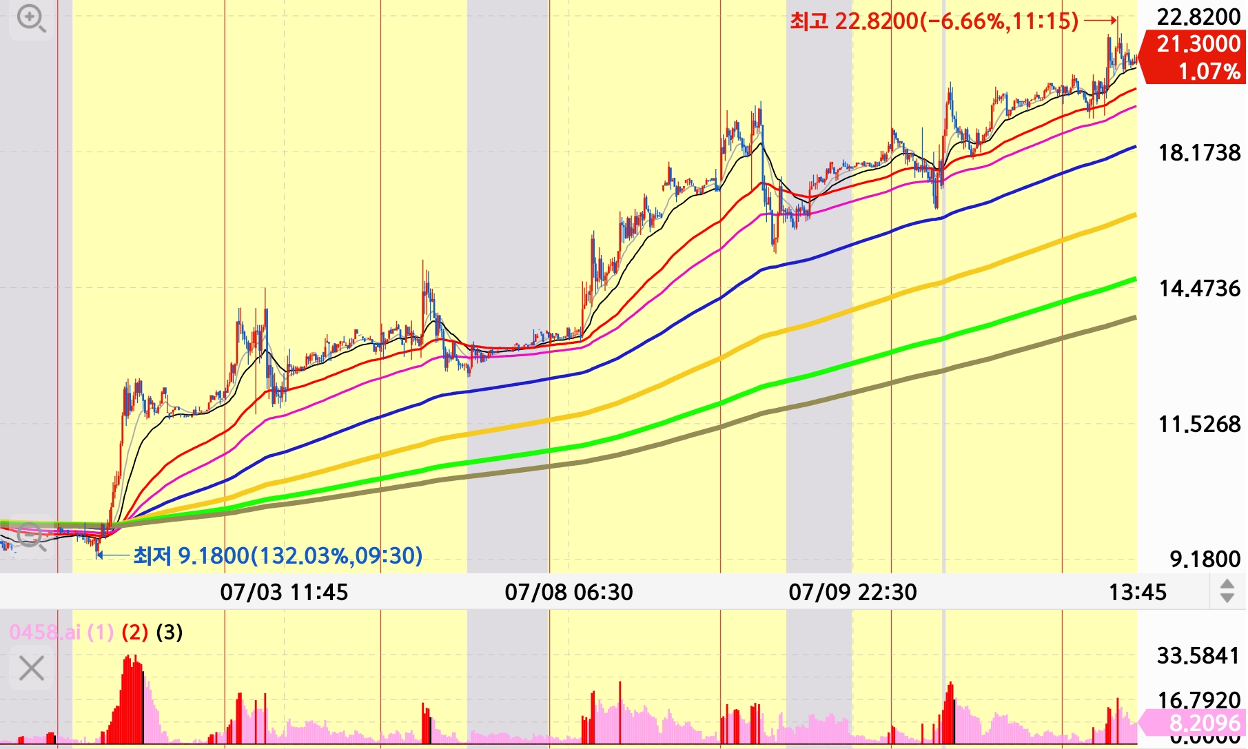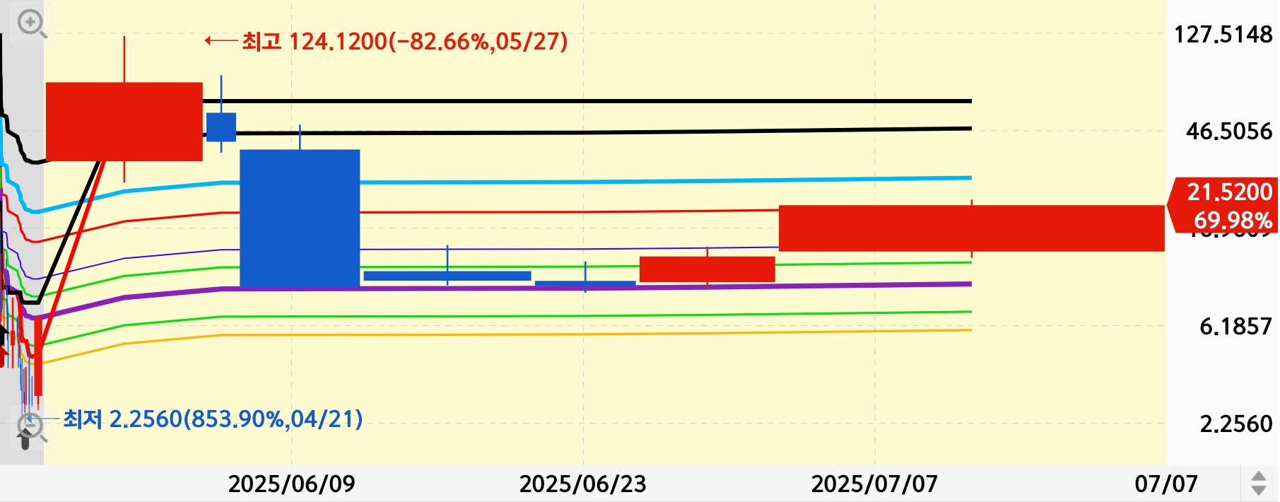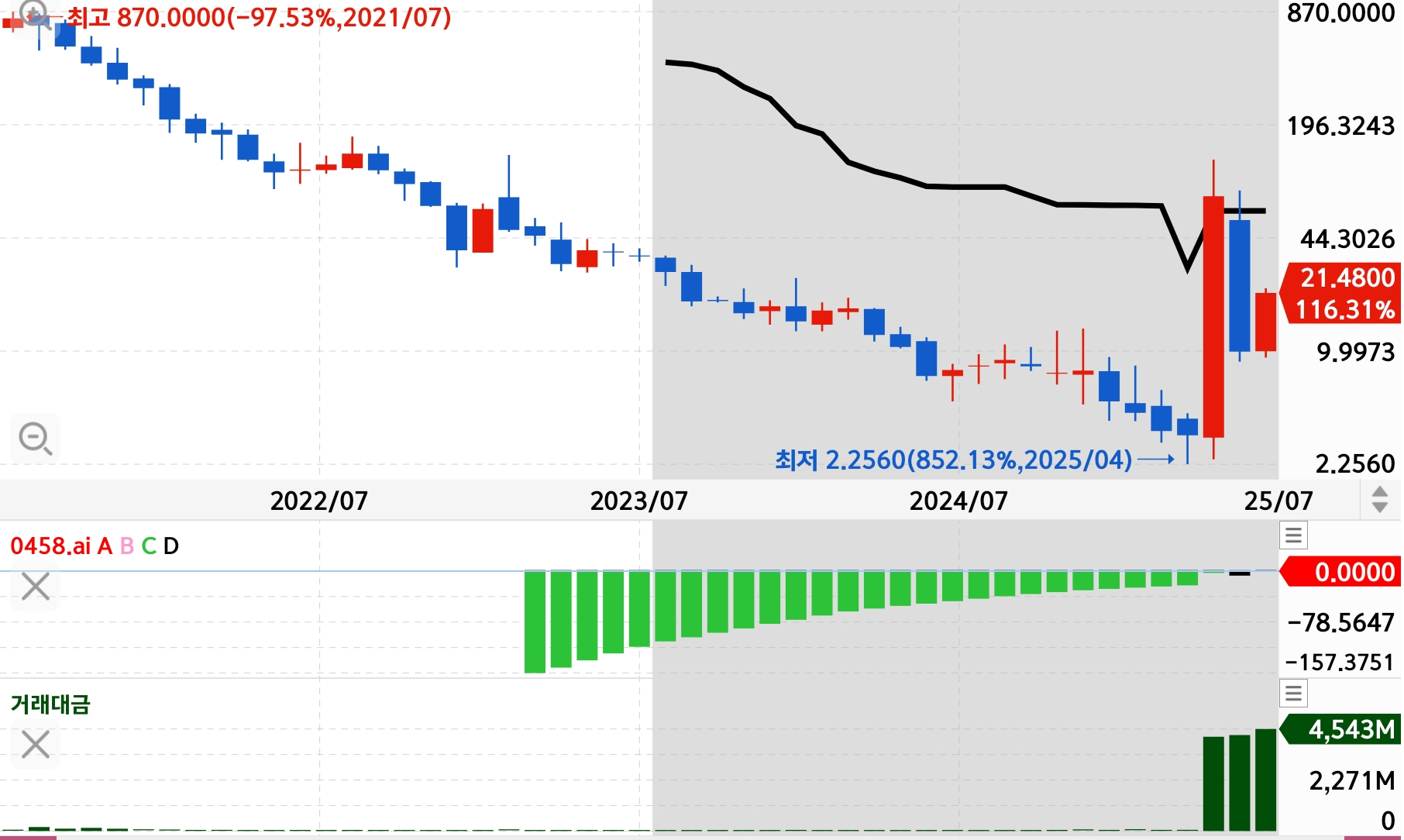 이 종목의 시세 판단은 하이킨아시 주봉이 상대적으로 선명해 보입니다.