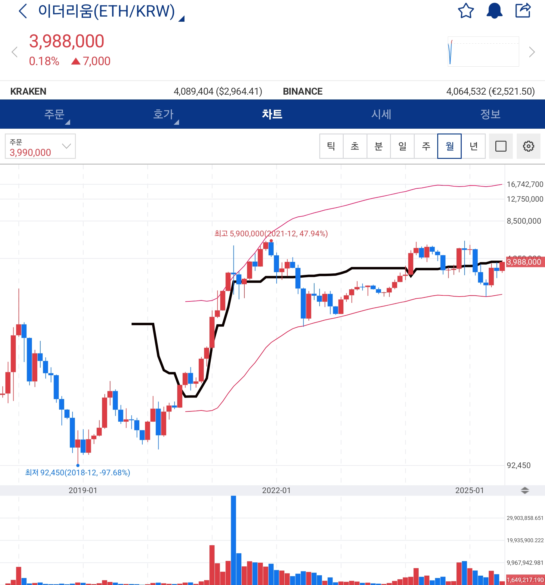 아래는 현재 거래되고 있는 이더리움의 시세입니다(월봉차트)
