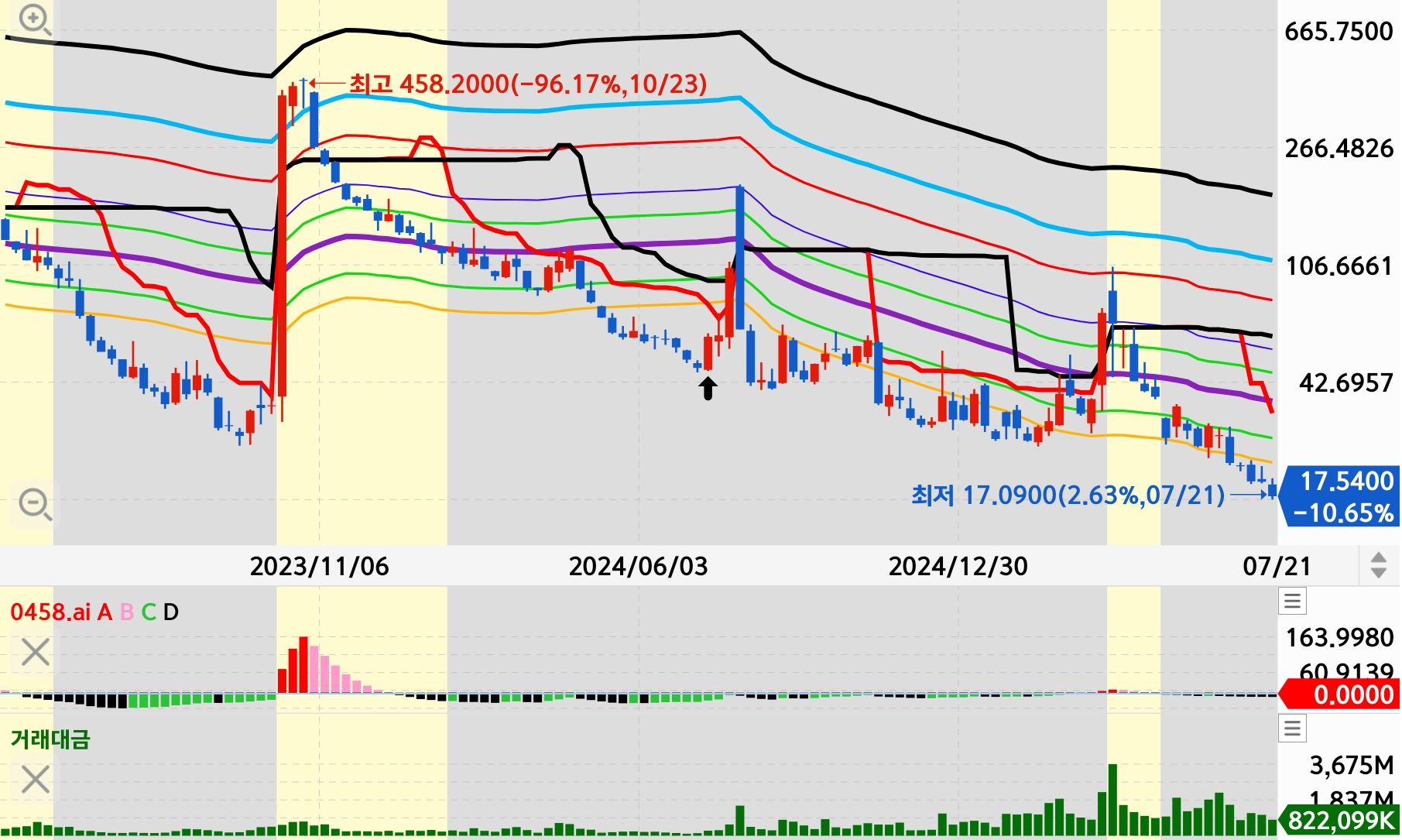 2025년 1월 15일, UVIX는 1:10 리버스 스플릿을 시행하여 기존 주식 10주가 → 새로운 주식 1주로 통합되고 단가는 10배 상승했습니다. 이 순간 차트에 458.2와 같은 초고가가 나타난 이유입니다.