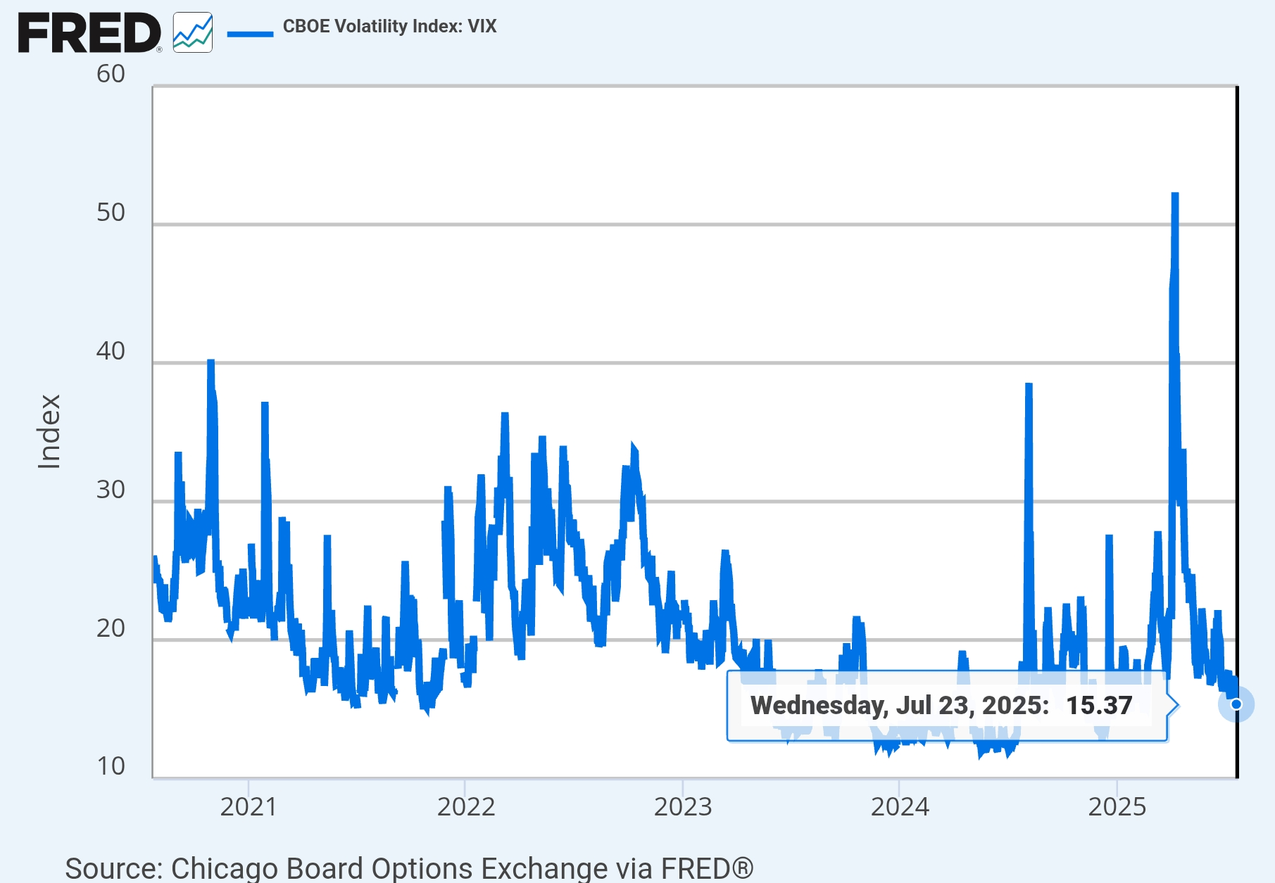 Source: Chicago Board Options Exchange Release: CBOE Market Statistics Units: Index, Not Seasonally Adjusted Frequency: Daily, Close Notes: VIX measures market expectation of near term volatility conveyed by stock index option prices. Copyright,