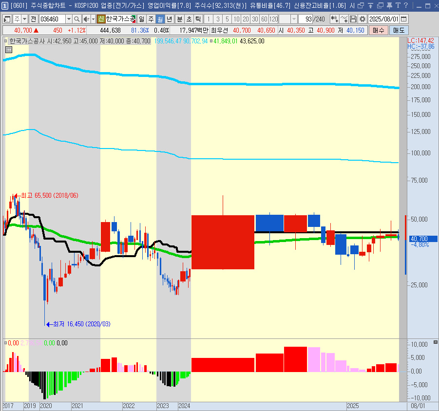 현재일 기준 한국가스공사의 주가는 40,700원이며 PER은 약4.7배, PBR은 0.32배입니다(FnGuide기준)