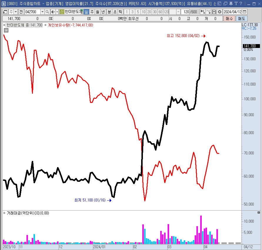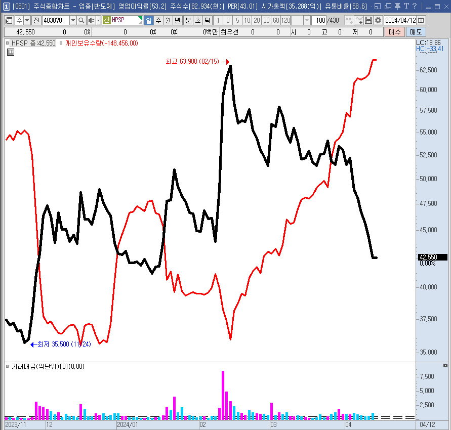 그런데 반도체 종목중 초기에 상승했던 HPSP는 현재 위의 3종목과는 완전히 반대의 움직임을 보이고 있다. 검정색 선이 아래에 놓여 있음을 볼 수 있다. 해석은 개인보유 수량이 늘어나니 주가는 맥을 못춘다?