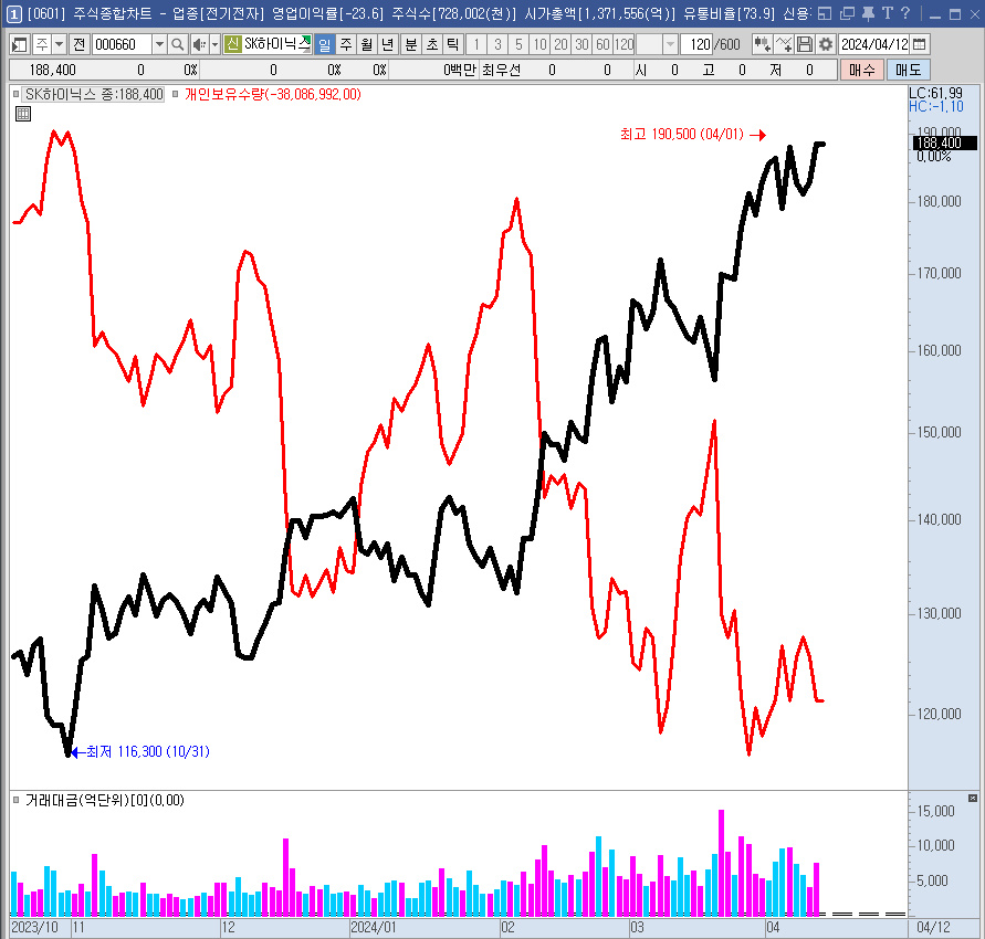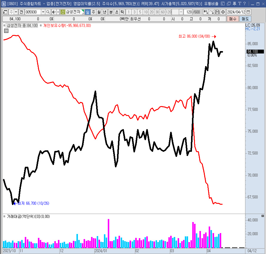 검정색 라인은 이동평균의 종가를 선으로 연결한 종가선 차트이고 빨간선은 개인보유수량인데 두개의 차트를 겹쳤다.